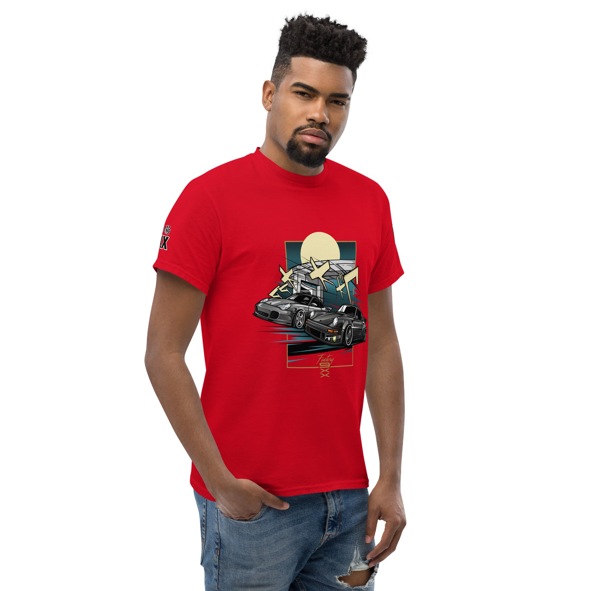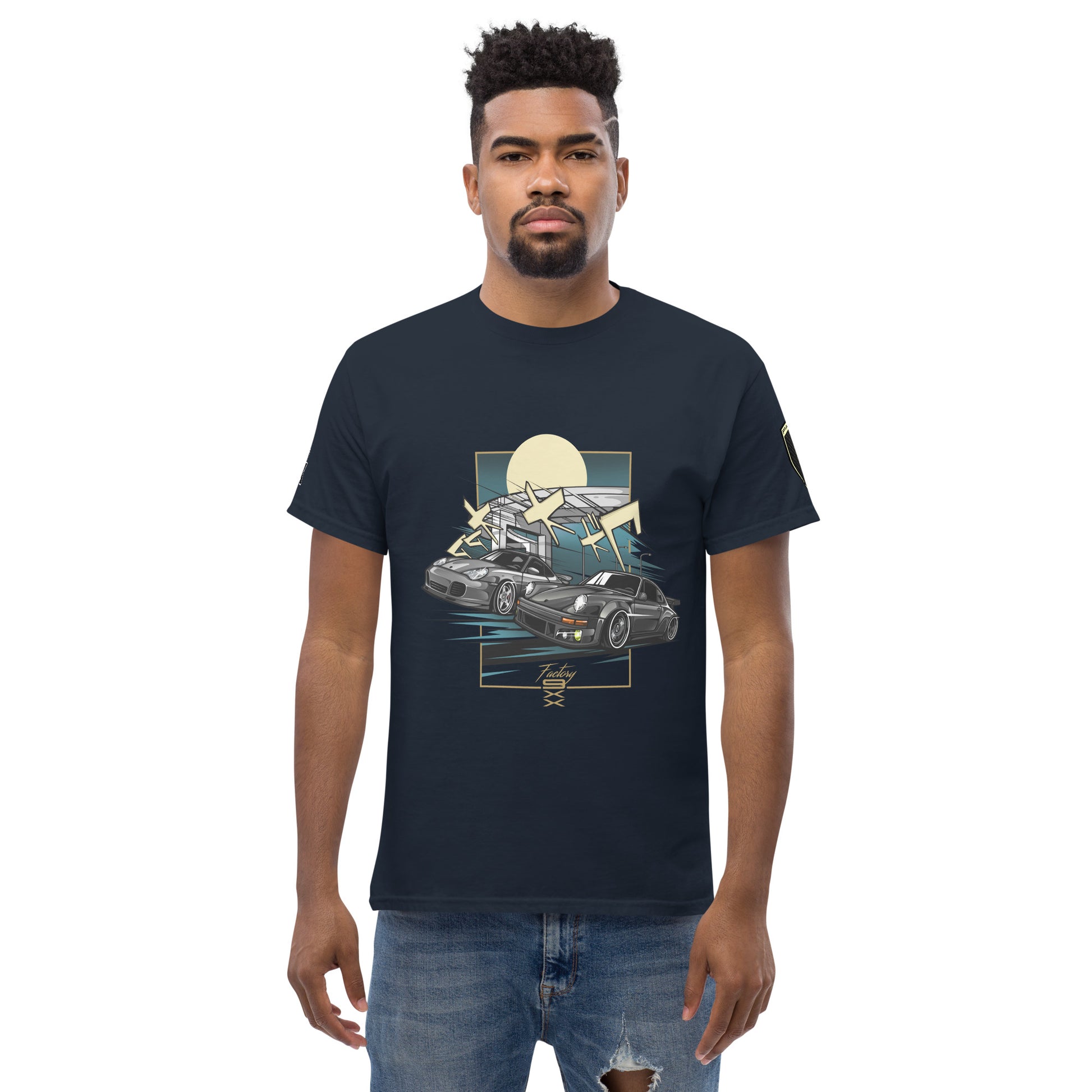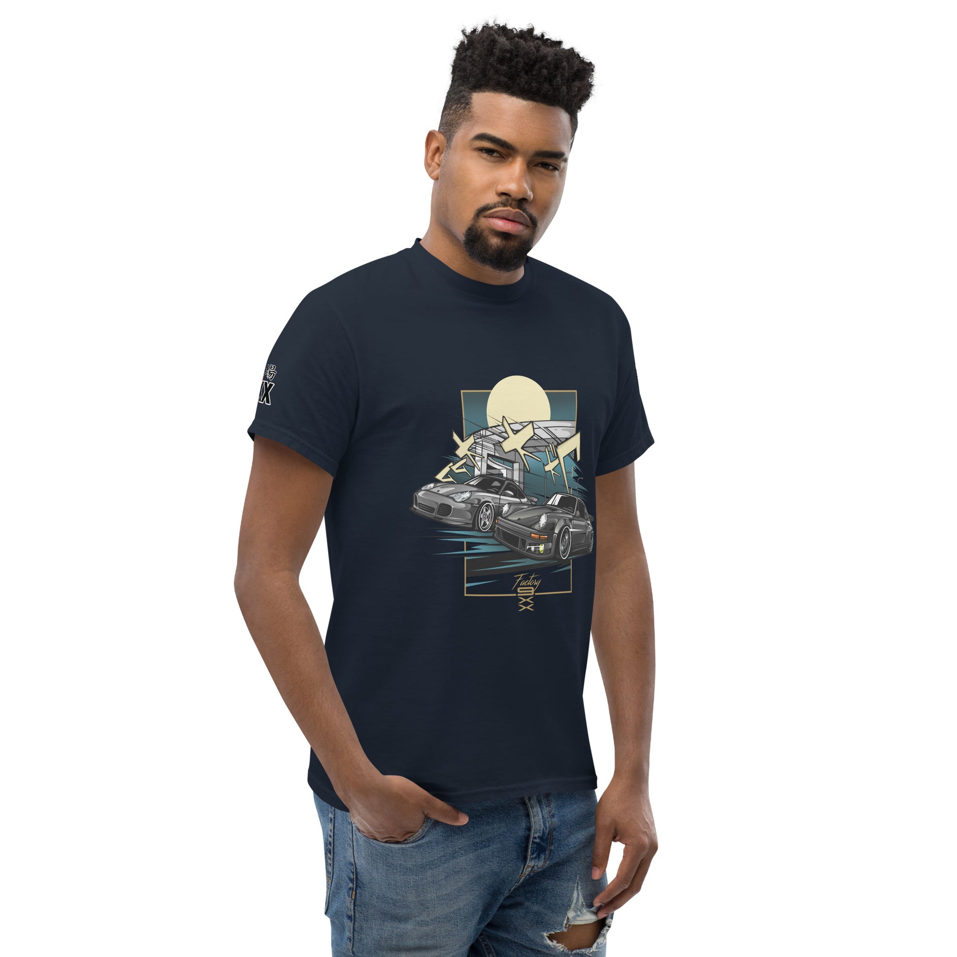 Our Porsche Wangan Style t-shirt is a must for any Porsche fanatic, especially if you are a fan Wangan Midnight Club. Our 996 Turbo and 930 ripping down the Wangan just make you wan to go out and drive! The 100% cotton men's classic tee will help you land a more structured look. It sits nicely, maintains sharp lines around the edges, and goes perfectly with layered streetwear outfits. Plus, it's extra trendy now