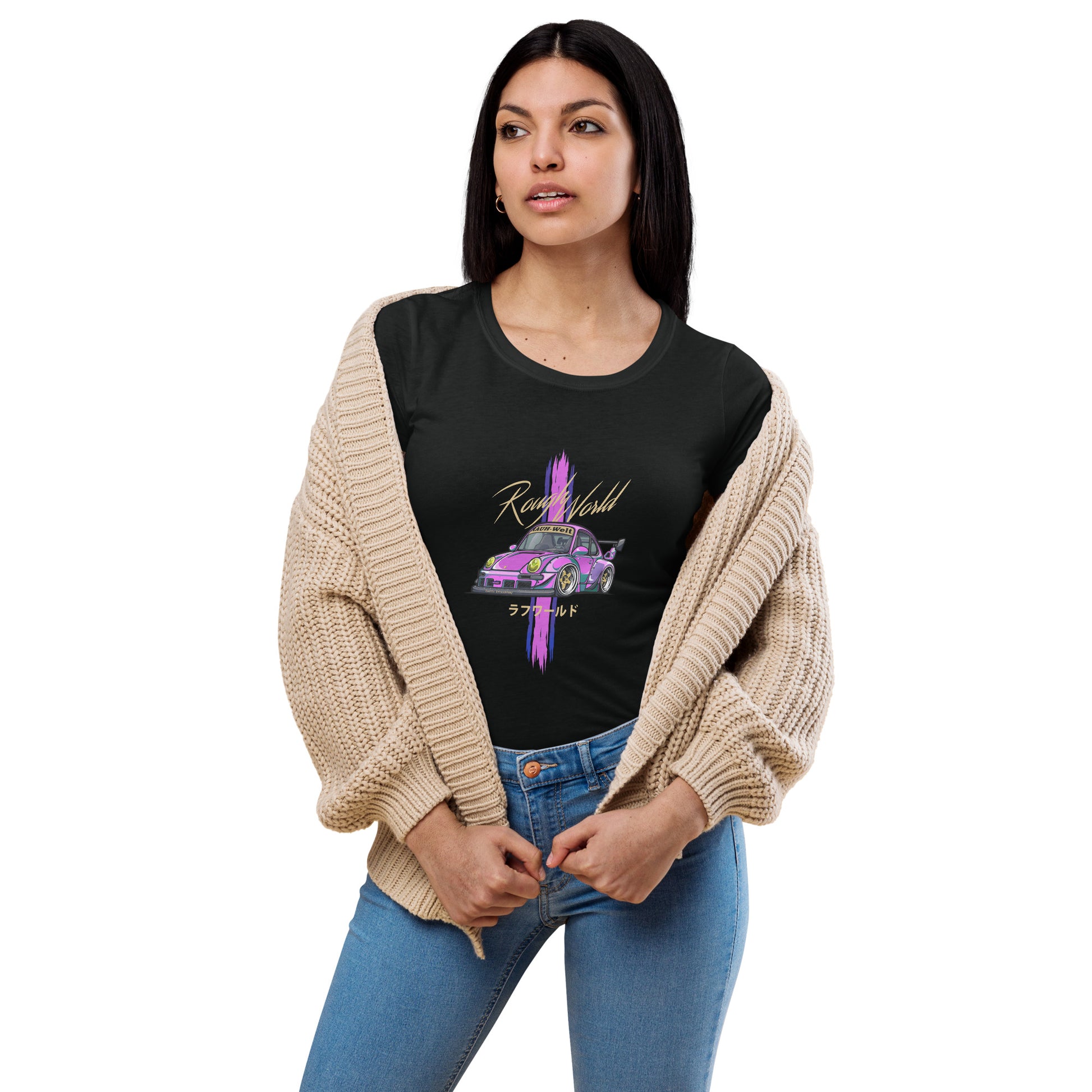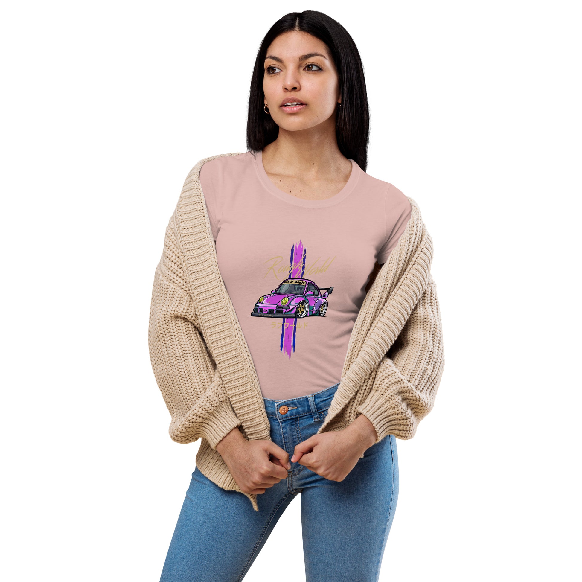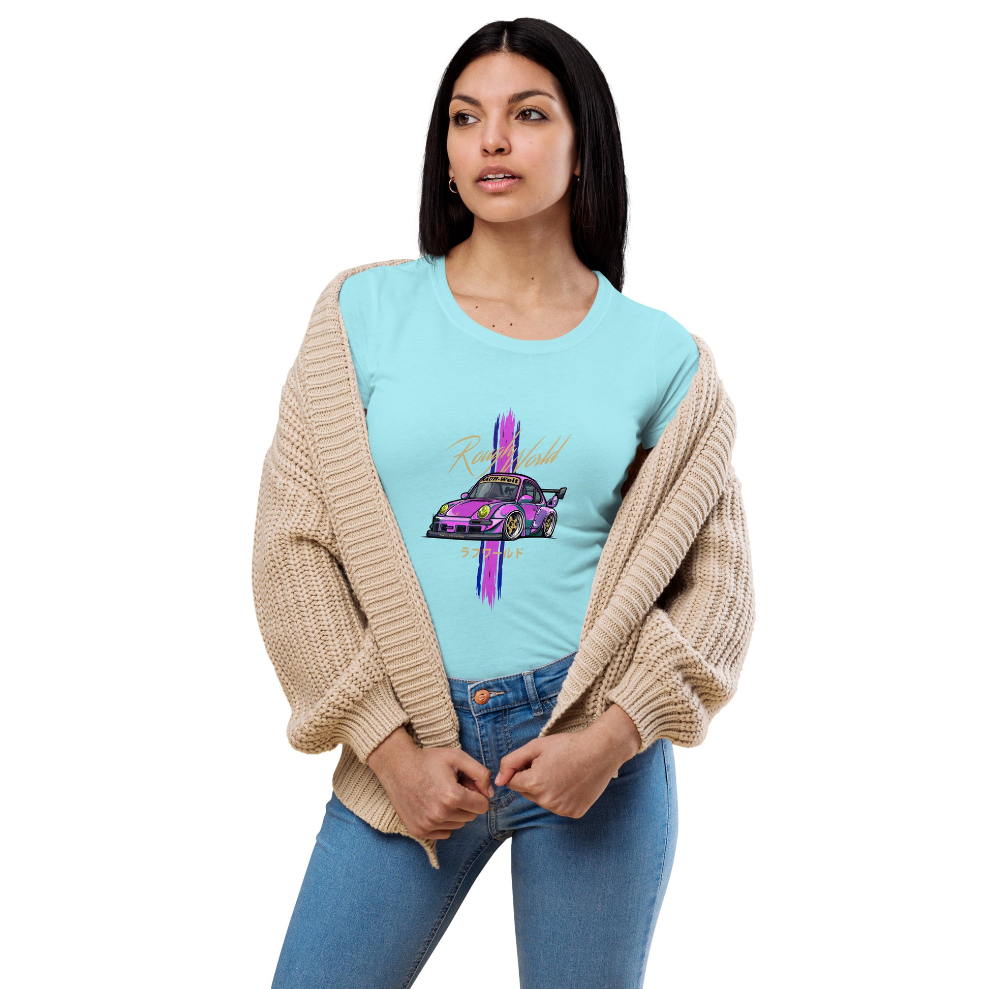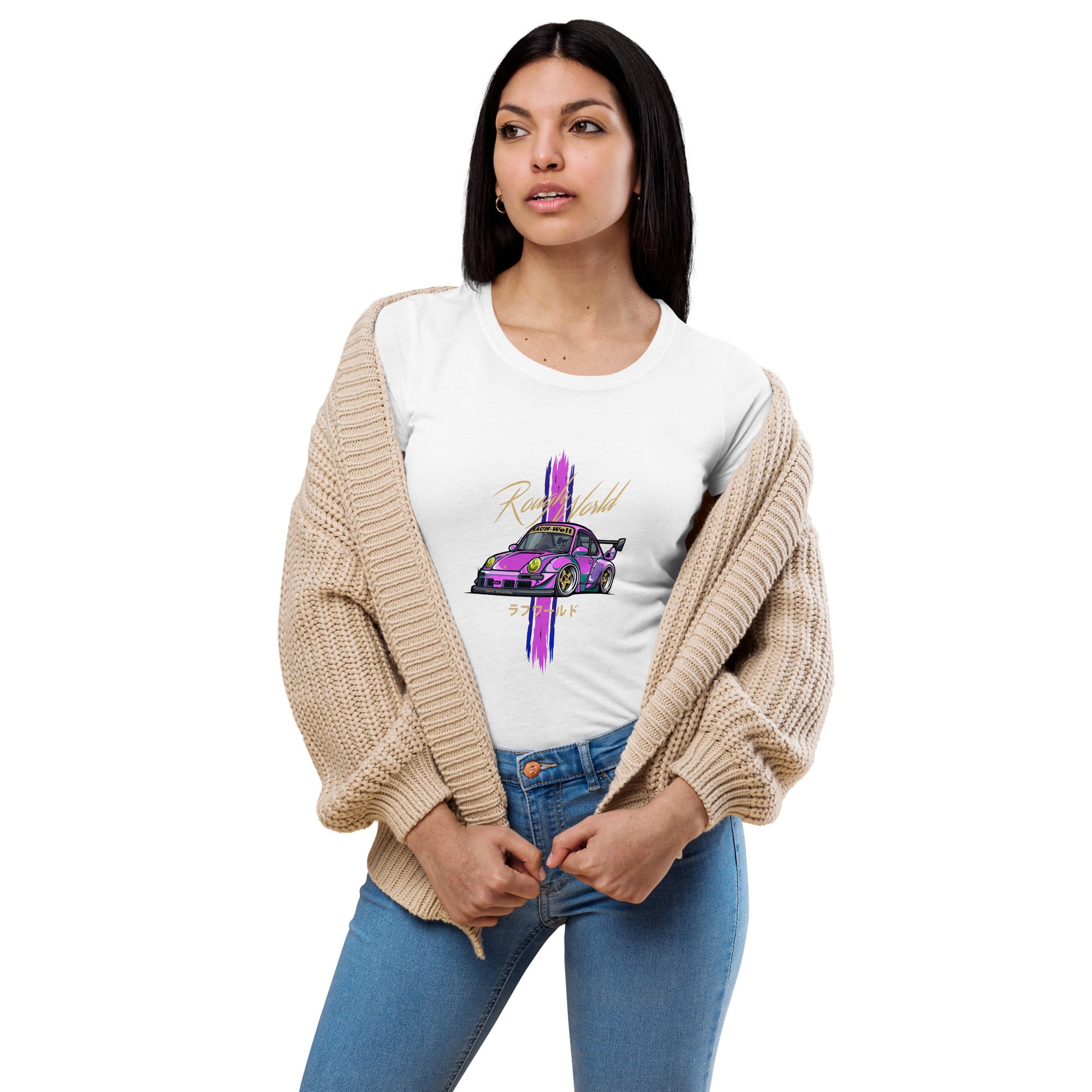 Any good Porsche enthusiast's wardrobe starts with a pair of classic blue jeans and a flattering, form-fitting basic tee. Our women’s RWB Porsche style fitted t-shirt will fill that must-have shirt spot as it’s super soft, stretchy, and complements the feminine silhouette.